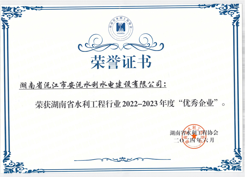 湖南省沅江市安沅水利水電建設(shè)有限公司在水利工程領(lǐng)域再傳佳音,榮獲2022—2023年度湖南省“優(yōu)秀企業(yè)”殊榮,彰顯了公司在技術(shù)創(chuàng)新、工程品質(zhì)、社會責(zé)任等方面的卓越成就。